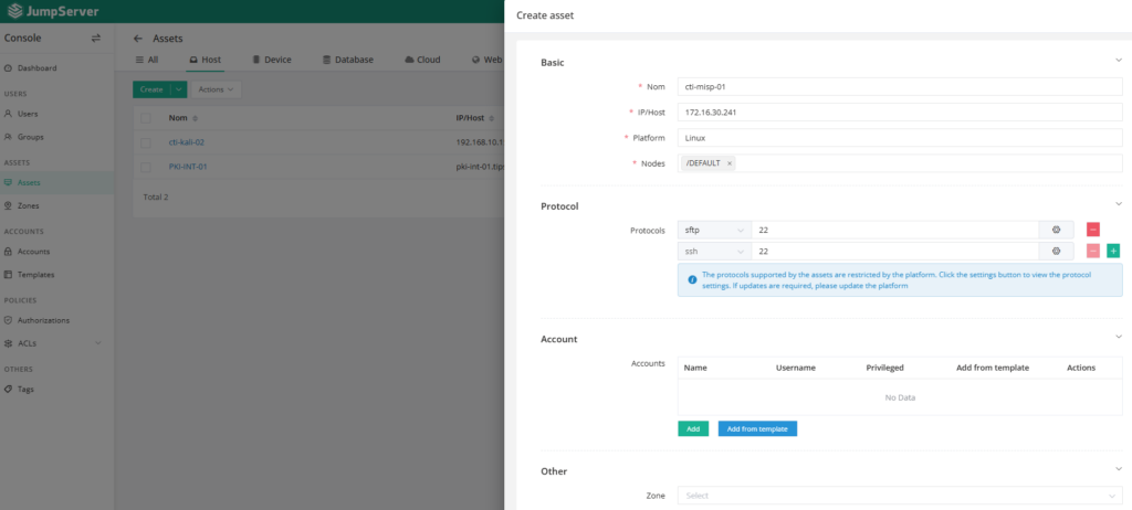 Pour ajouter un asset, rien de plus simple, on se rend sur Assets puis Create, et on choisi son type. Ensuite, on renseigne les champs classiques, ainsi que le user qui sera utilisé pour la connexion.