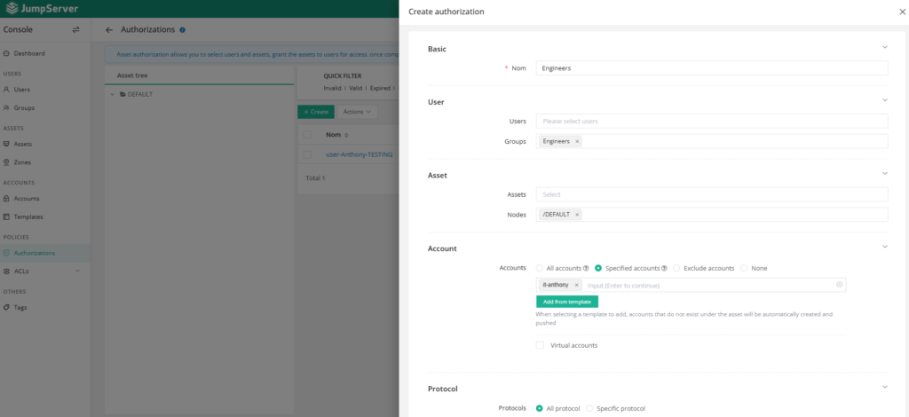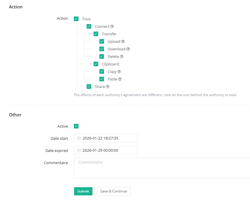 On peut bien entendu autoriser seulement certains comptes, certains protocoles, ou encore autoriser ou non l’upload/download, le copy/paste… et même définir une durée pour notre règle !